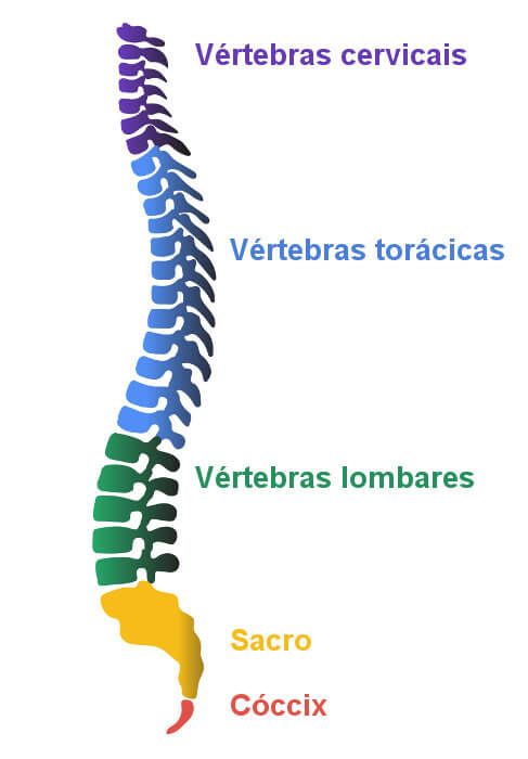 - Divisão: A coluna é separada em regiões: cervical (pescoço), torácica (meio das costas), lombar (parte baixa), sacral e coccígea.