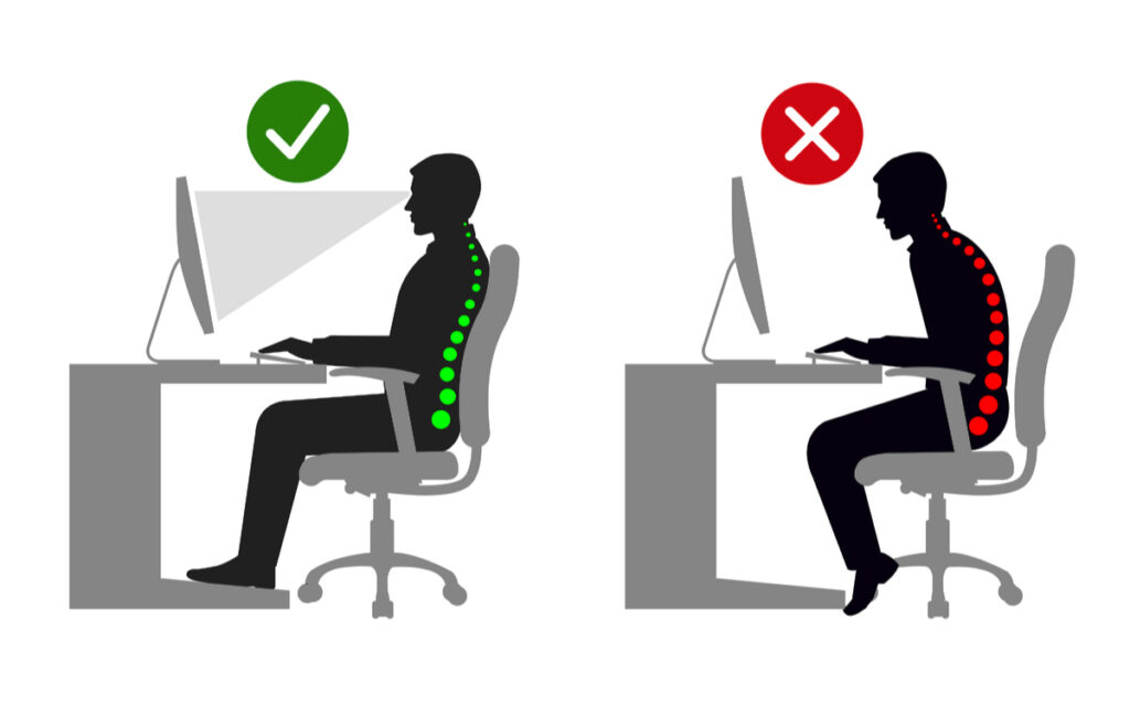 - Mantenha uma postura adequada ao sentar, trabalhar ou usar o celular/computador